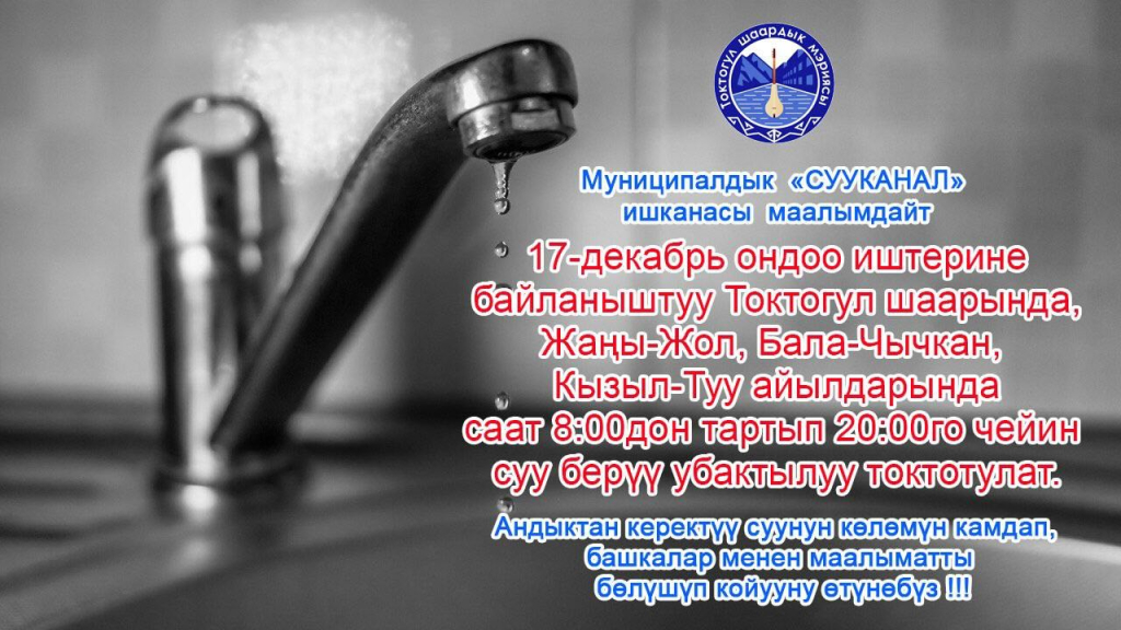 Эртен, үстүбүздөгү жылдын 17-декабрь күнү суу башатын оңдоо иштери пландалгандыгына байланыштуу Токтогул шаарында, Бала-Чычкан, Кызыл-Туу жана Жаңы-Жол айылдарында саат 8:00дөн 20:00 гө чейинки аралыкта суу берүү токтотулаарын маалымдайбыз.